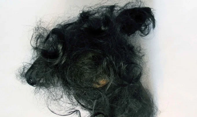 Jayne Dyer, Dear, 2013, resin, human hair, 40 x 30 x 28cm, presented in vitrine (20 x 24 x 34cm) on display table (24 x 28 x 83cm)