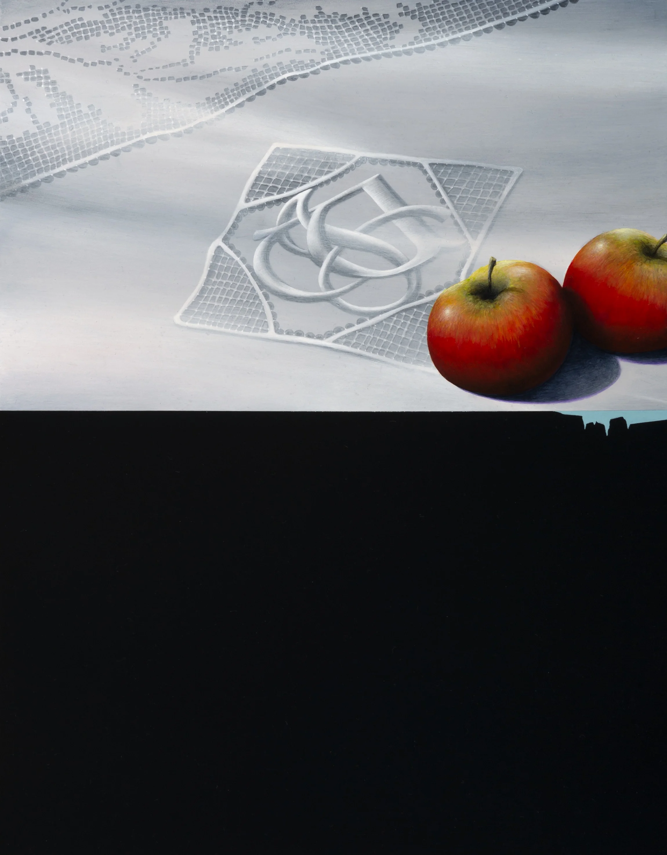 From salacious apples tumbling through space to curious crocodiles housed within chequered foyers, Jarek Wojcik invites you to enter a world of exquisite beauty. From within these hyper-real worlds Wojcik combines the still life tradition with modern artefacts to offer a self-reflexive critique of the history, perception and status of traditional painting methods in contemporary art.